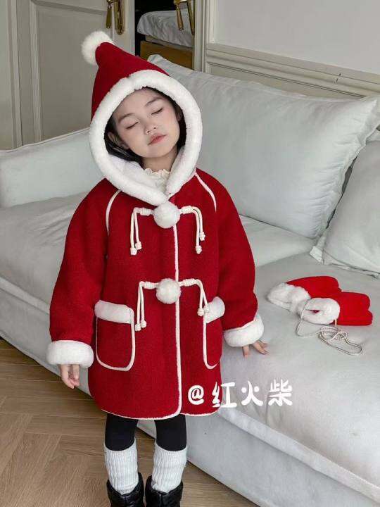 红火柴女童外套冬装2024新款加绒洋气儿童冬季一体绒连帽上衣加