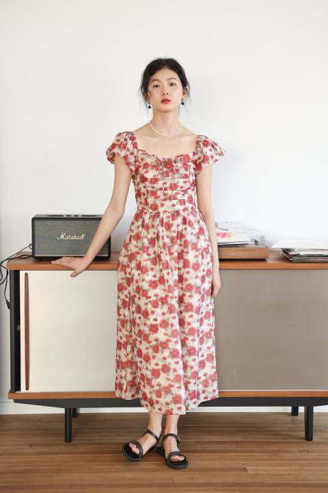 夏树繁花 玫瑰印花法式茶歇连衣裙方领碎花裙收腰显瘦复古度假裙