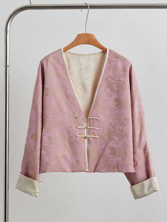 一线品牌专柜商场撤回剪标新中式清冷禅意V领上衣粉色提花衬衫女