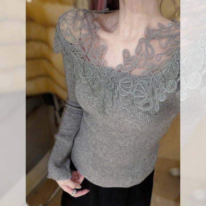 法式灰色蕾丝拼接针织打底衫女秋冬轻奢高级感内搭气质绝美小上衣