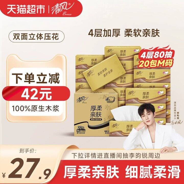 清风抽纸金装厚柔4层M码80抽20包,领礼金