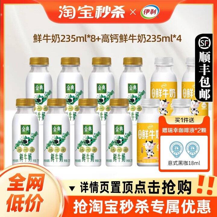 下拉详情拍,37💰贈:咖啡液*2个,伊利金典鲜牛奶235ml*8瓶+高钙235ml*4瓶
