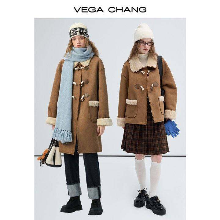 VEGA CHANG巴恩风皮毛一体短外套女冬2024年新款牛角扣加绒短外套