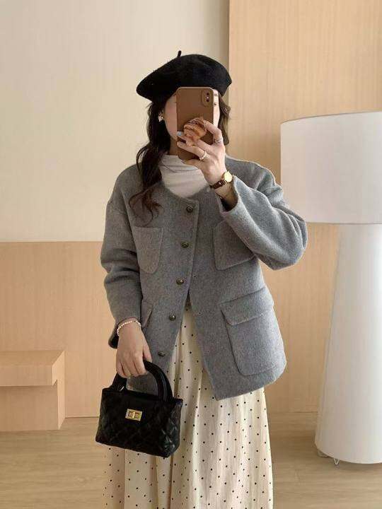 新款小个子羊毛无领双面羊毛大衣宽松单排扣口袋装饰女式外套