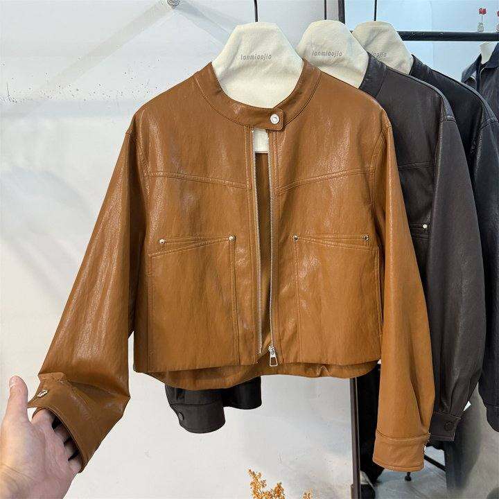 实体店买的,搜同款推给姐妹。皮衣抗风,防水,也好打理,擦一下就干净,比冲锋衣时尚点。最近下雨,一刮风360度飘洒,需要个防水的上衣。我买的桔色,店员说是爱马仕橙,也没有爱马仕不知道正不正宗。配的牛仔裤:复古色、喇叭裤,被评价港风。后背有捏褶,收腰,也不漏风。还是个短款,显腿长。