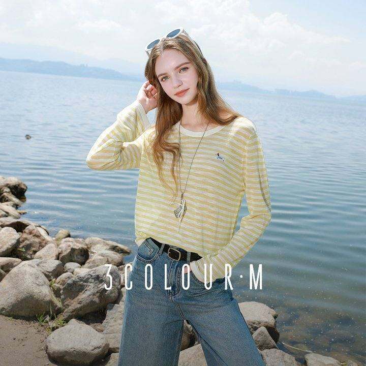 三彩2025夏季新款慵懒风圆领微透条纹针织衫宽松防晒上衣女轻薄M