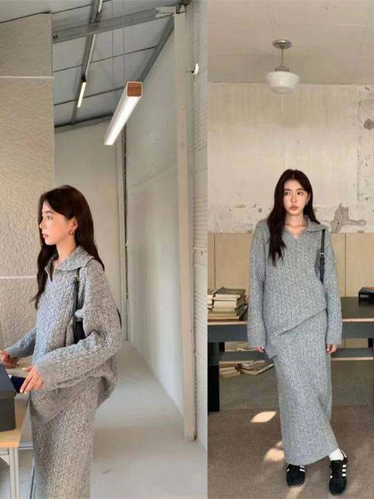 【围炉】秋冬 慵懒 宽松 翻领毛衣 绞花针织衫 半身裙 两件套