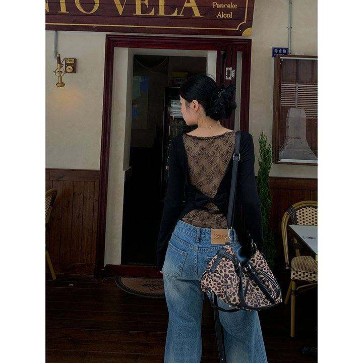红人馆黑色打底衫女2024新款春秋蕾丝t恤内搭辣妹设计感长袖上衣
