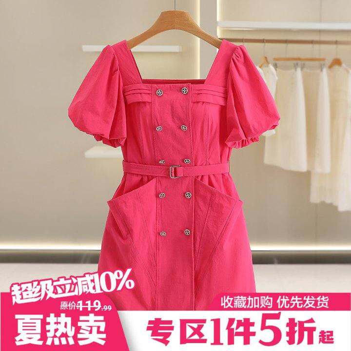 【珞】双排扣修身纯色泡泡袖连衣裙夏季女装2025新款专柜撤柜正品