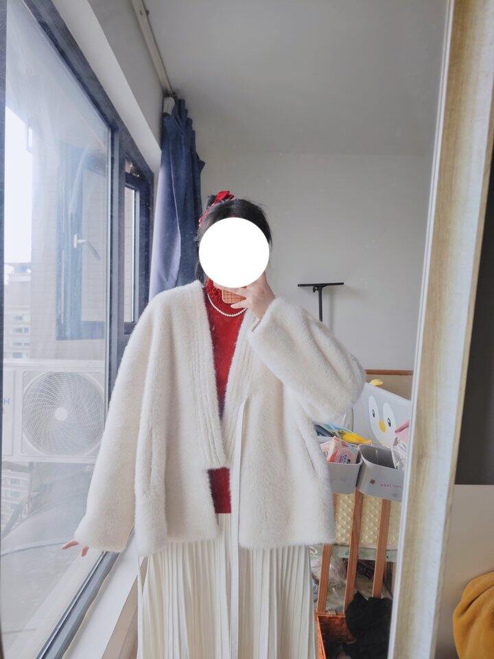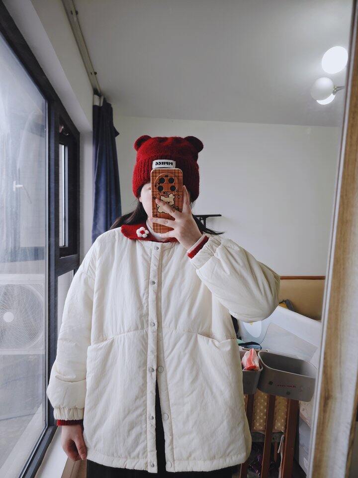 今天是红白小花[哈哈][哈哈]。姐妹们可别买这种美丽的废物外套了,没拉链没纽扣,太重了导致穿着一直往后垂,要不停的提衣服,不保暖,我已经在寻摸找裁缝看能不能加个拉链了[大哭][大哭]