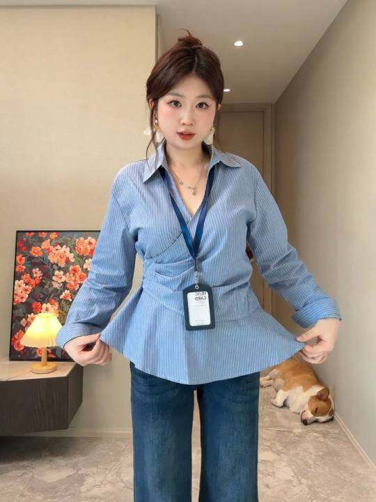 大码胖mm韩系褶皱收腰交叉条纹衬衫女秋装遮肉显瘦设计感衬衣上衣
