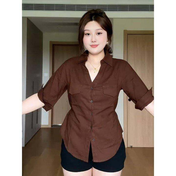 大尺码法式覆古polo领衬衫女夏季2025新款胖mm正肩上衣遮肉显瘦衬衫