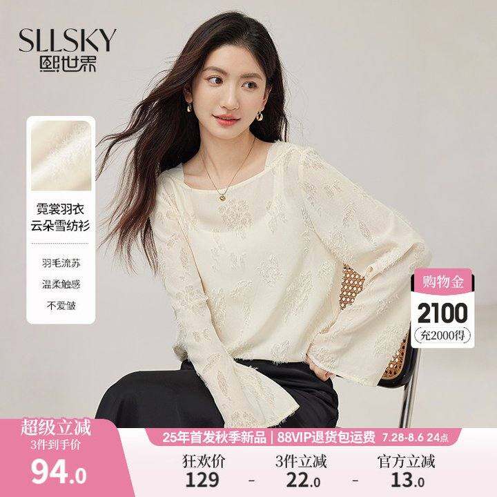 熙世界羽毛流苏一字领雪纺衫女2025秋季新款高级感喇叭袖宽松上衣