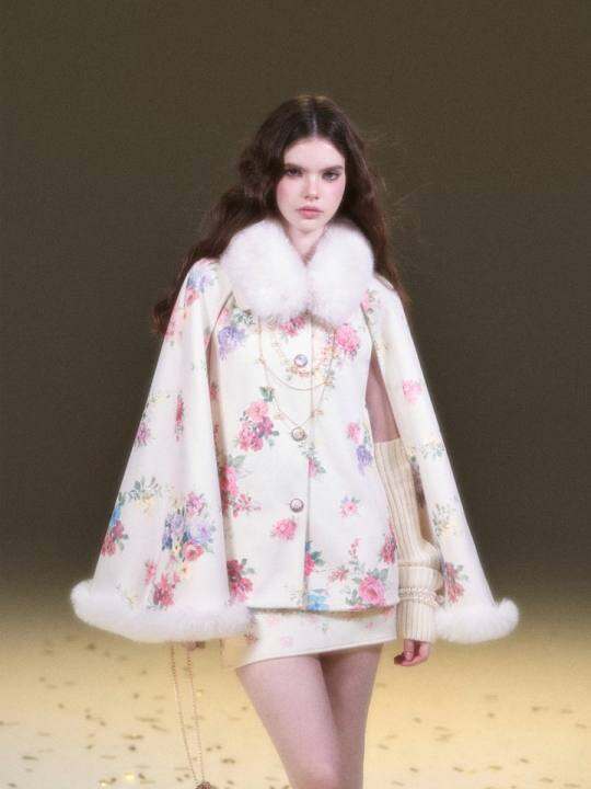 RunRunSweet原创 覆古油画花朵印花双面毛呢斗篷外套半裙套装