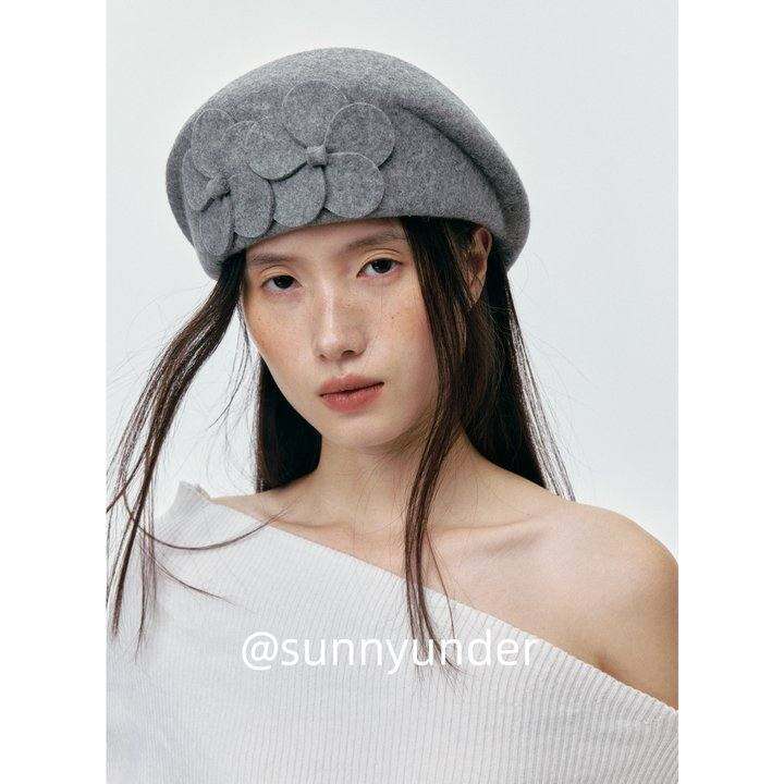 时髦灰色花朵羊毛呢贝雷帽子女秋冬韩版日系英伦复古空姐礼帽ins