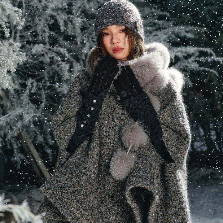 陈十五25秋冬【嘉柏俪】高领羊毛混纺粗花呢夹羽绒斗篷