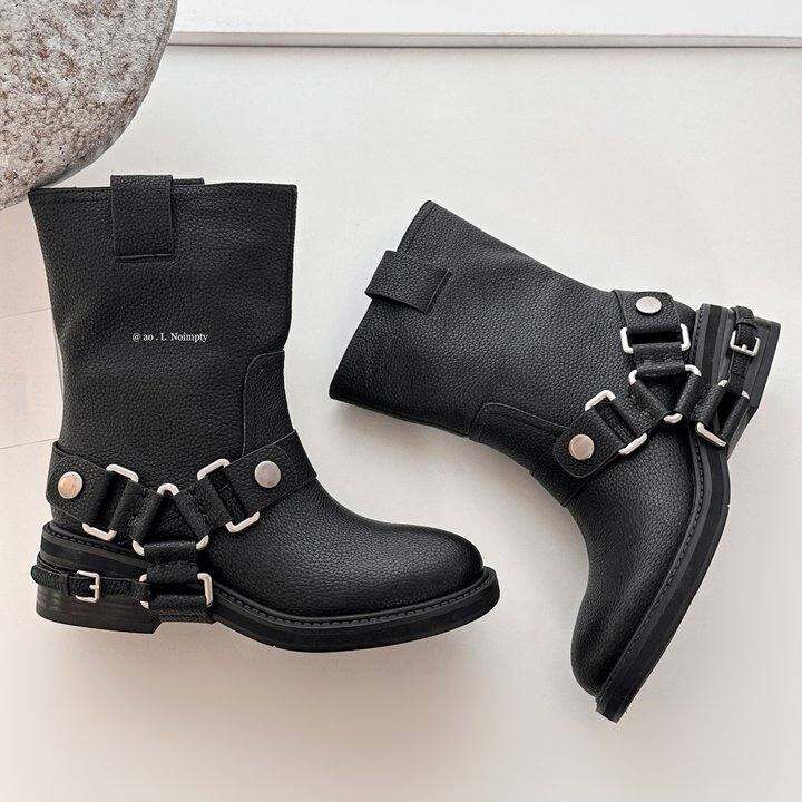 5cm牛皮圆头真皮女英伦风马丁靴短靴时尚小众一脚蹬复古显瘦靴子