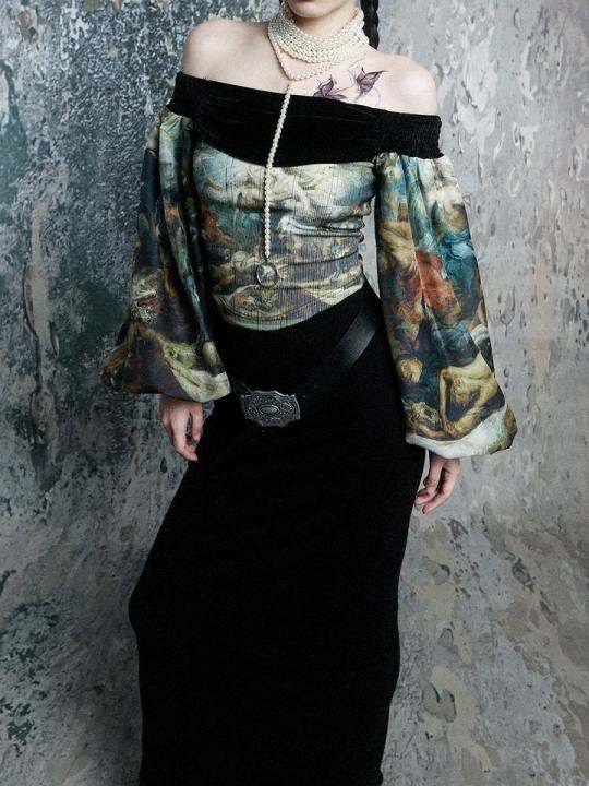 michicat自制复古欧洲油画宫廷灯笼袖修身丝绒一字领露肩上衣B414