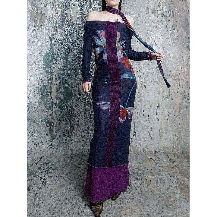 michicat自制复古新中式紫兰花拼接丝绒飘带层次连衣裙长裙春B415