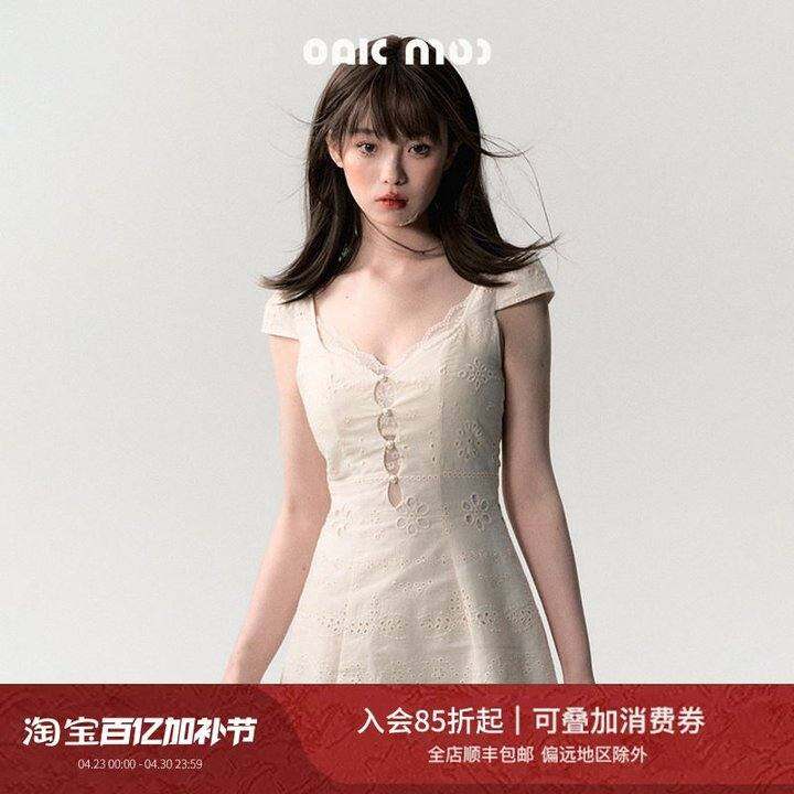 OAKMOO奶油白蕾丝连衣裙夏季简约修身U型领A字裙棉质泡泡袖连衣裙