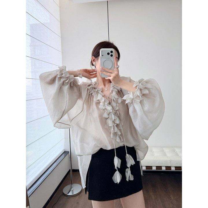 THEWING|雾感米灰花瓣系带铜氨丝混纺慵懒 v领飘逸灯笼袖气质上衣