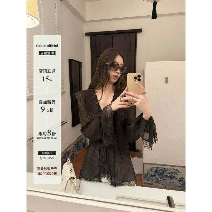 Gakee official 法式蕾丝花边V领雪纺衫女春夏季肌理感荷叶边衬衣