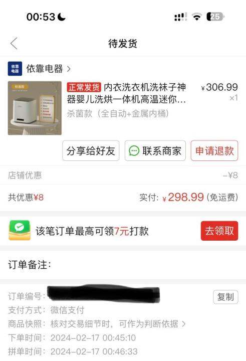 非购买链接,在PDD下半单价格¥298.99,可以返利55.7,298.99-55.7=243.29