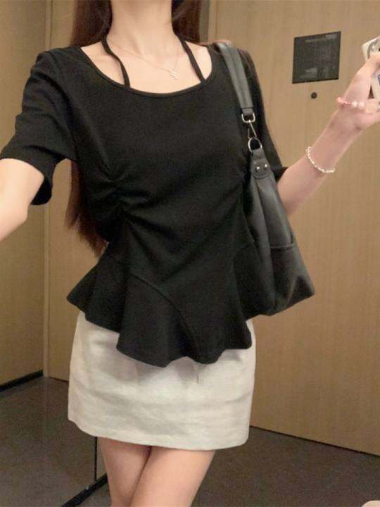 大码挂脖短袖T恤女夏季新款白色内搭打底衫胖mm显瘦正肩减龄上衣