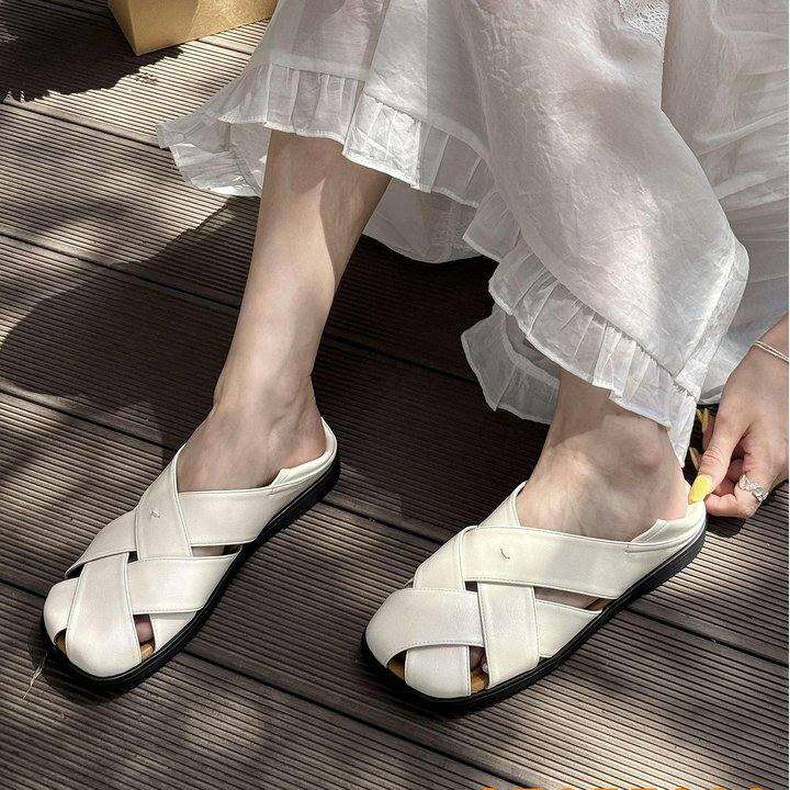 通勤宽头方头凉鞋可踩跟女复古镂空编织罗马鞋