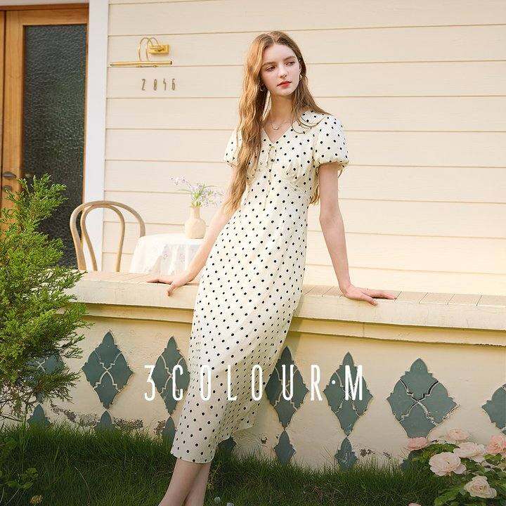 三彩2025夏季新款法式复古波点印花连衣裙V领短袖收腰A字长裙女M