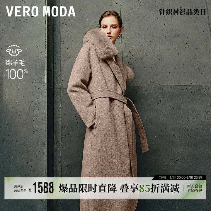 Vero Moda毛呢大衣女2024秋新款狐狸毛领双面呢纯绵羊毛简约静奢