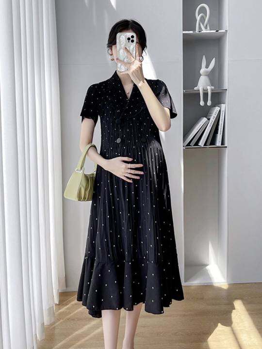孕妇装夏天裙子2023夏季新款短袖打底长裙波点皱褶西装裙连衣裙女