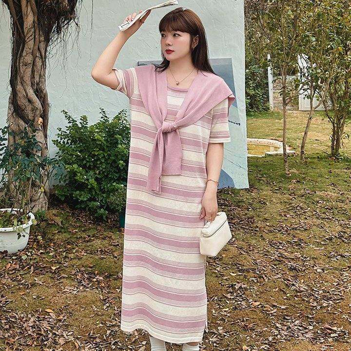 大码女装龄学院风披肩连衣裙2024春夏新品胖mm显瘦条纹针织裙女