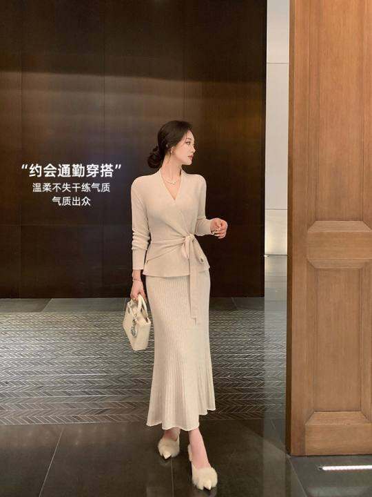 林关关韩系气质v领针织套装裙女秋冬高级感包臀裙鱼尾裙子两件套