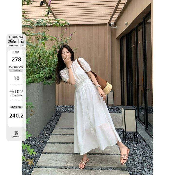 pusumede 白茶清欢 两件套法式泡泡袖洋装女收腰气质中长版裙子