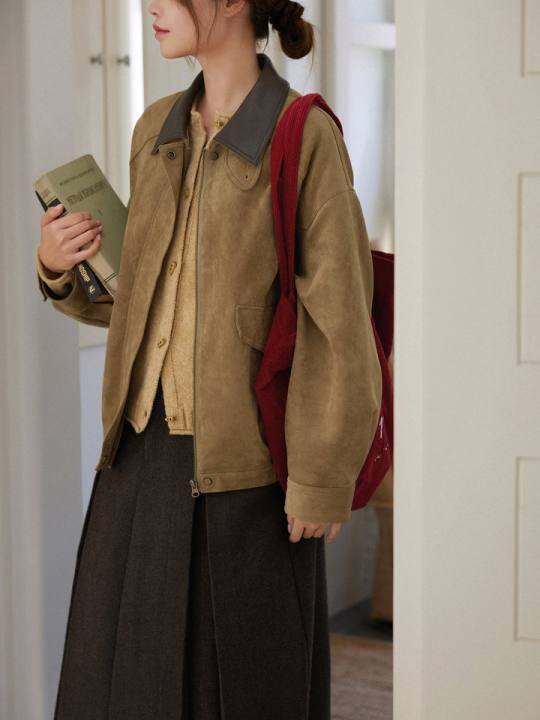 「MISAZ」中古感外套 奶咖棕色绒面麂皮 廓形撞色翻领飞行员夹克