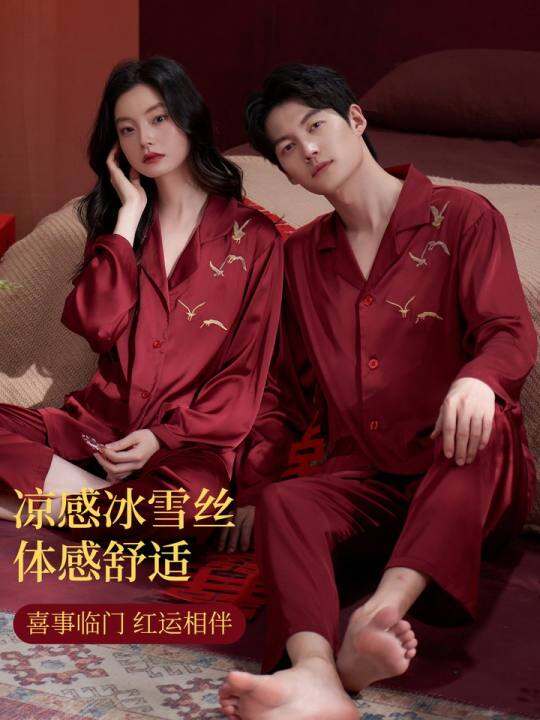 乐姿梦情侣红色睡衣春夏季柔软冰丝套装男女士喜庆结婚新婚家居服