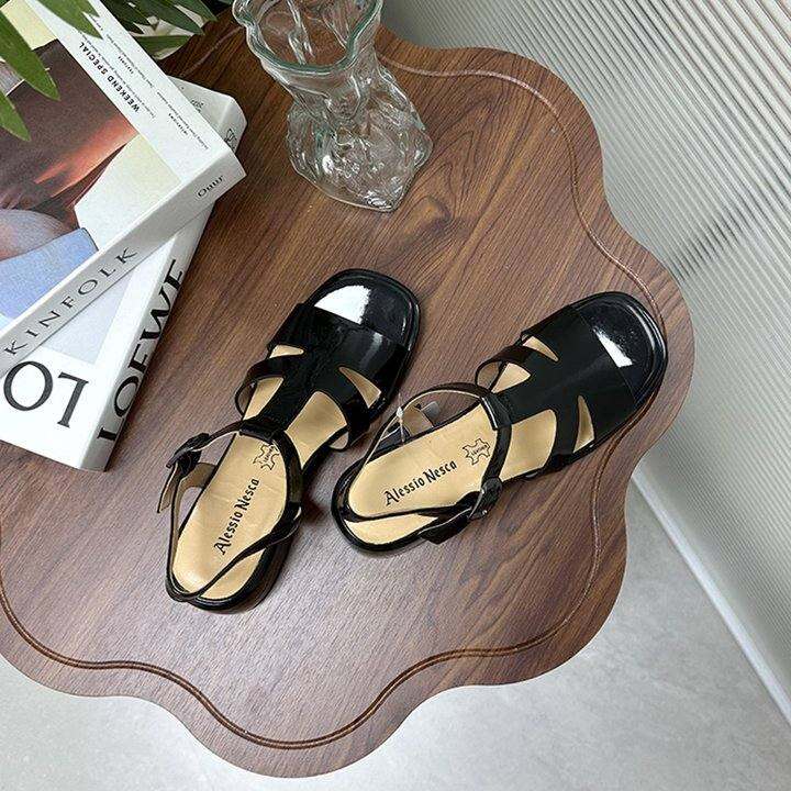 俄罗斯纯原 百搭一字带真皮复古黑色罗马鞋搭扣大码粗跟女凉鞋