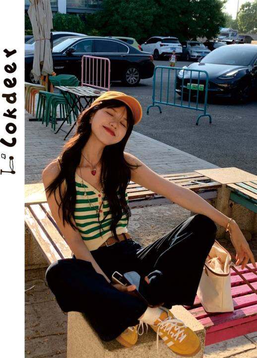 lokdeer「西瓜森林」韩系夏日背心撞色纽扣 绿白条纹背心