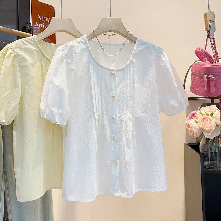 韩版气质压褶圆领娃娃衫女2024夏新款洋气减龄设计感宽松显瘦衬衫