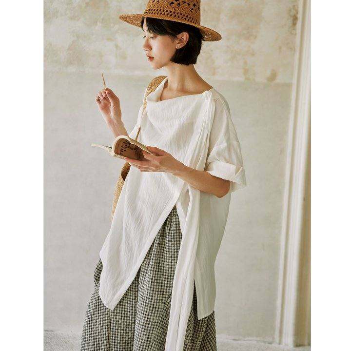 VIMIE2025夏季新不对称设计款宽松衬衫垂折领侧开 𫔭衩短袖纯色衬衫女