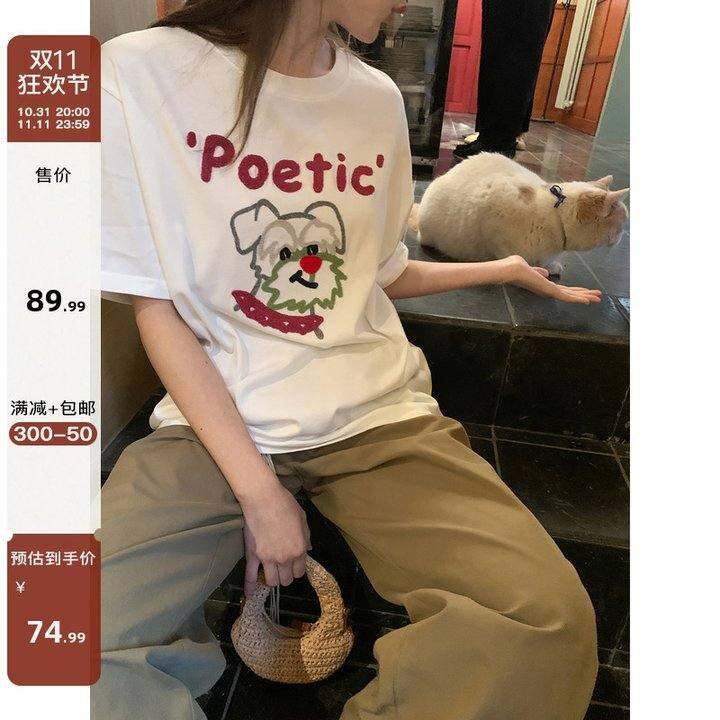 你好卡农 原创彩色线条小狗毛巾绣短袖t恤女夏季新款宽松纯棉上衣
