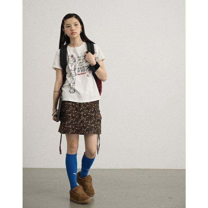 Hellooo Eat 两色字母印花t恤2025春季宽松百搭复古圆领短袖上衣