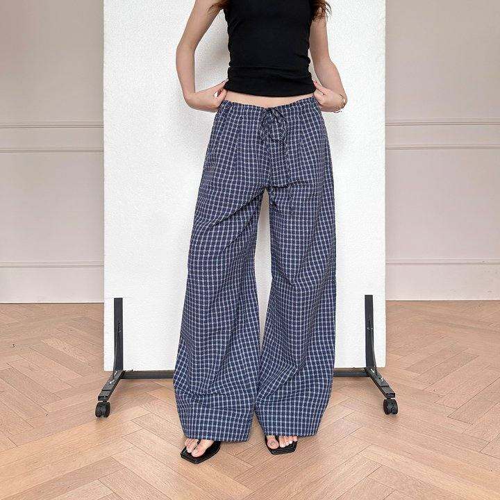 〔怕热入!不费劲穿搭〕HUFFNPUFF复古蓝格纹条纹阔腿格子裤跳舞