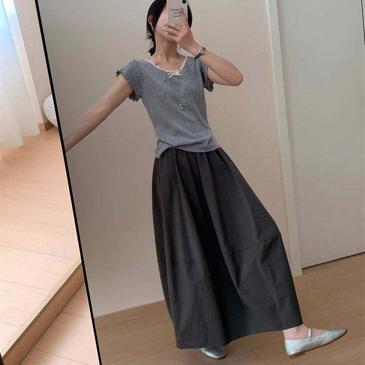 韩系百搭慵懒风松紧高腰花苞半裙2025夏季新款简约中长伞裙A字裙