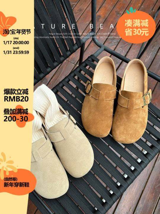 自然卷真皮勃肯鞋女2023新款秋季休闲单鞋全包一脚蹬平底鞋小皮鞋