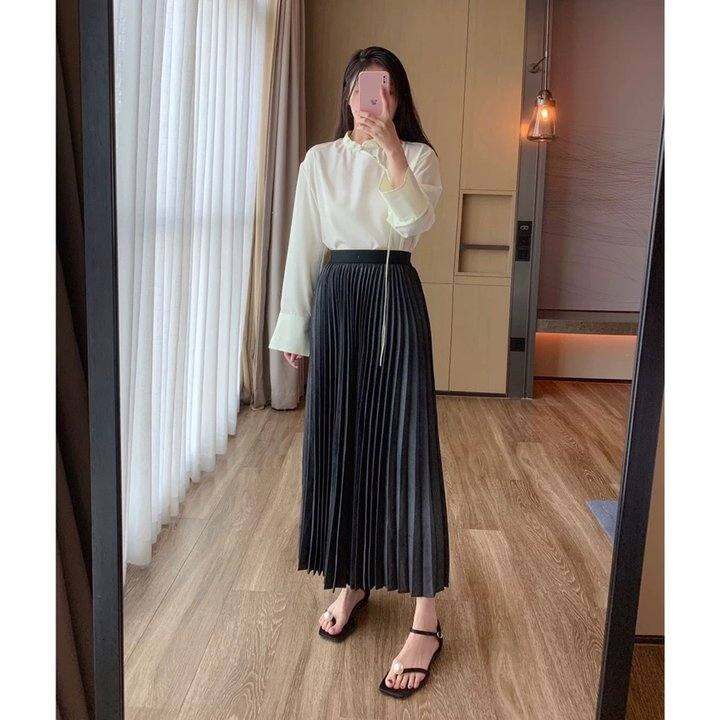 纯色松紧腰百褶半身裙女中长款高腰显瘦百搭半裙