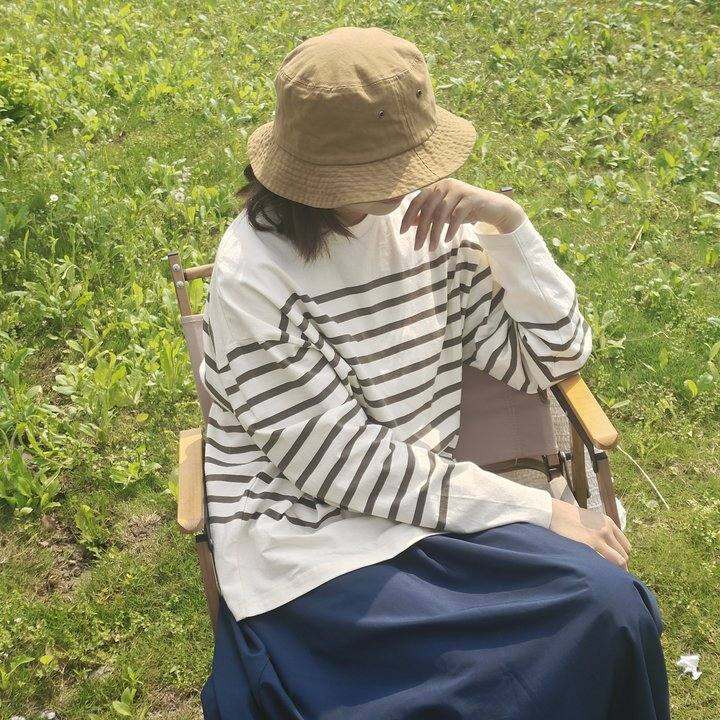 日单女士全棉宽松圆领百搭打底衫显瘦经典横条纹长袖T恤
