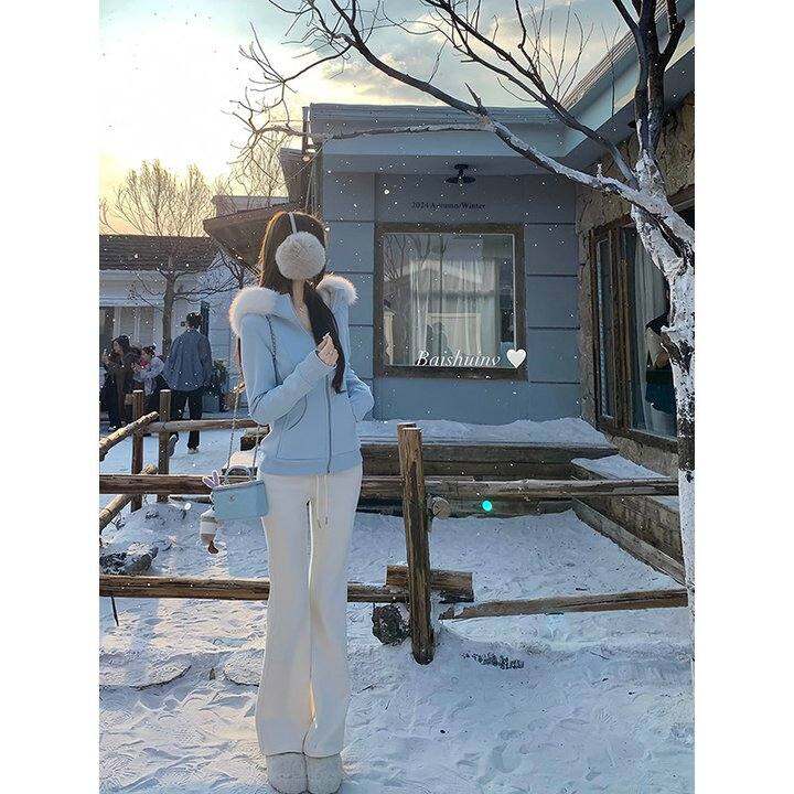 白水女 冬日绒绒裤 灰色加厚加绒休闲裤女秋冬慵懒高腰保暖微喇裤