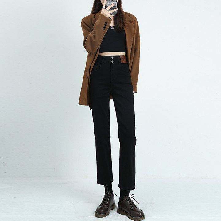 加绒黑色高腰直筒牛仔裤女2023年秋冬新款九分小个子显瘦烟管裤子